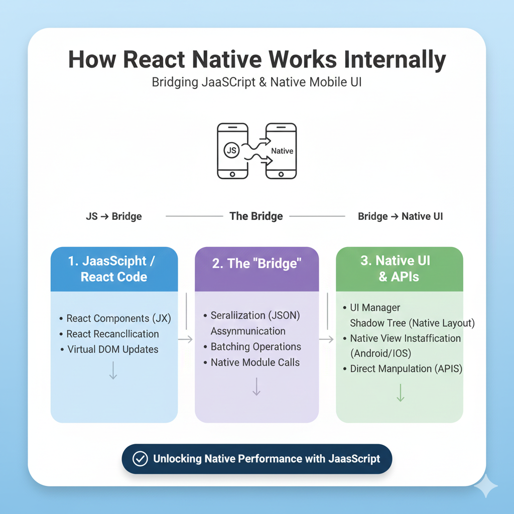 Ever wonder how JavaScript becomes a native app? We break down React Native's internal architecture—the JS thread, UI thread, JSI bridge, and new concurrent features—with examples and best practices for developers.