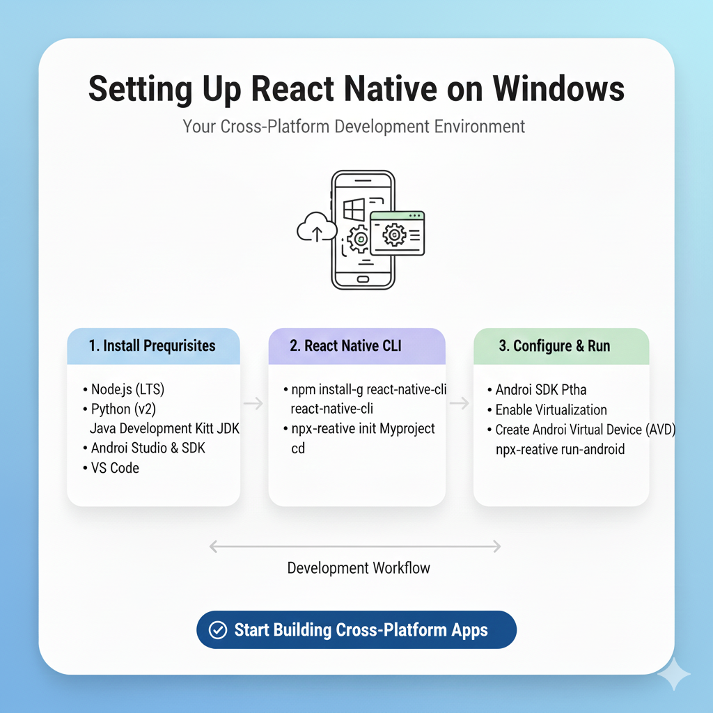 Struggling to set up React Native on Windows? This step-by-step guide walks you through everything from Node.js to your first mobile app. No fluff, just working code.